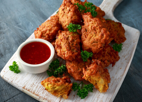 Succulent fresh prawns are generously coated in a flavorful chickpea flour batter that has been